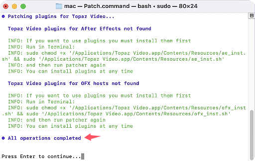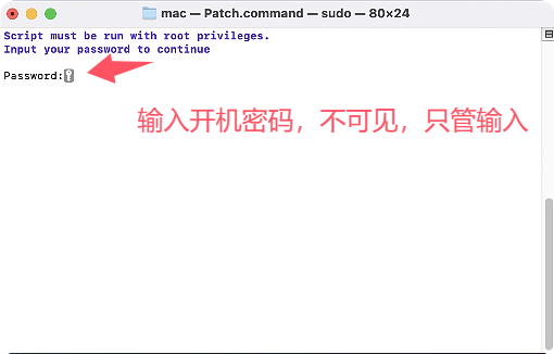 2、软件安装完成后,先不要打开软件,拖动软件包中的 Patch.command(激活工具) 到桌面上,双击桌面上的 Patch.command,会自动打开终端,如下图,输入你的电脑密码,(输入密码的时候不会显示,只管输入完密码按回车键)