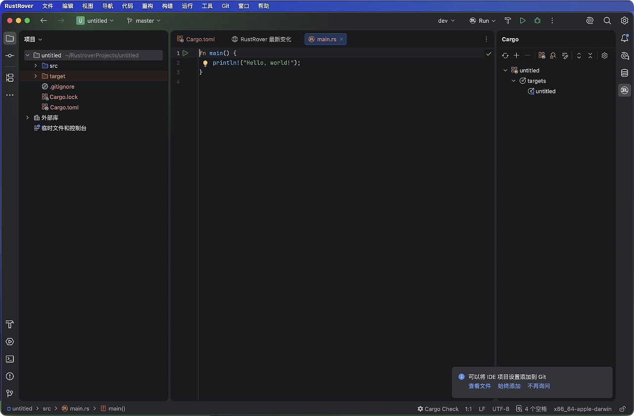 项目快速启动:支持直接导入 Cargo 项目,自动识别 Cargo.toml 并配置依赖,新手可零配置上手 。