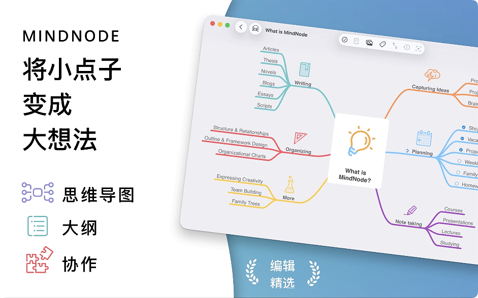 每个个伟大的创意都始于一个想法。然后又一个想法。再然后是千百万个想法。MindNode 是面向 Mac 和 iOS 的最实用的头脑风暴应用。它能帮助您捕捉想法,以清晰的图片记下自己的构思。