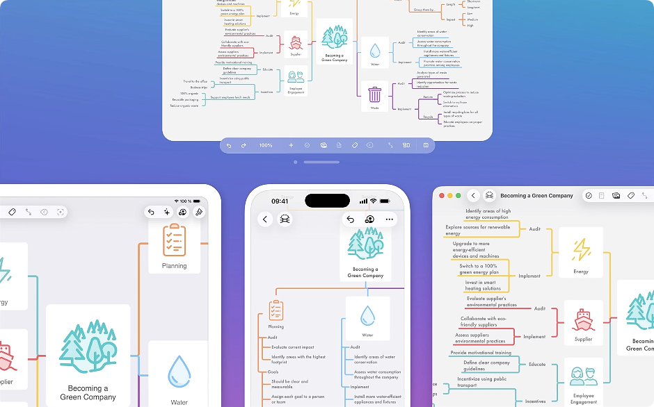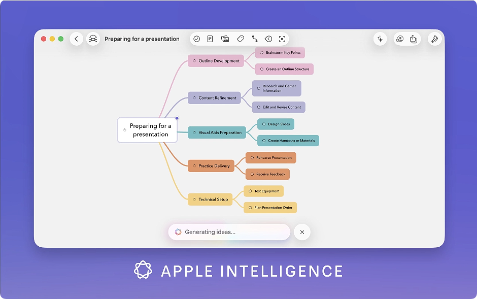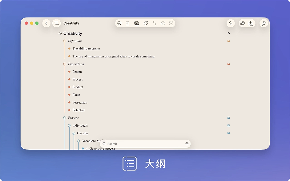 使用 MindNode,通过各种操作捕捉您的想法,例如编辑、重新排列、折叠节点以及导入和导出文件。