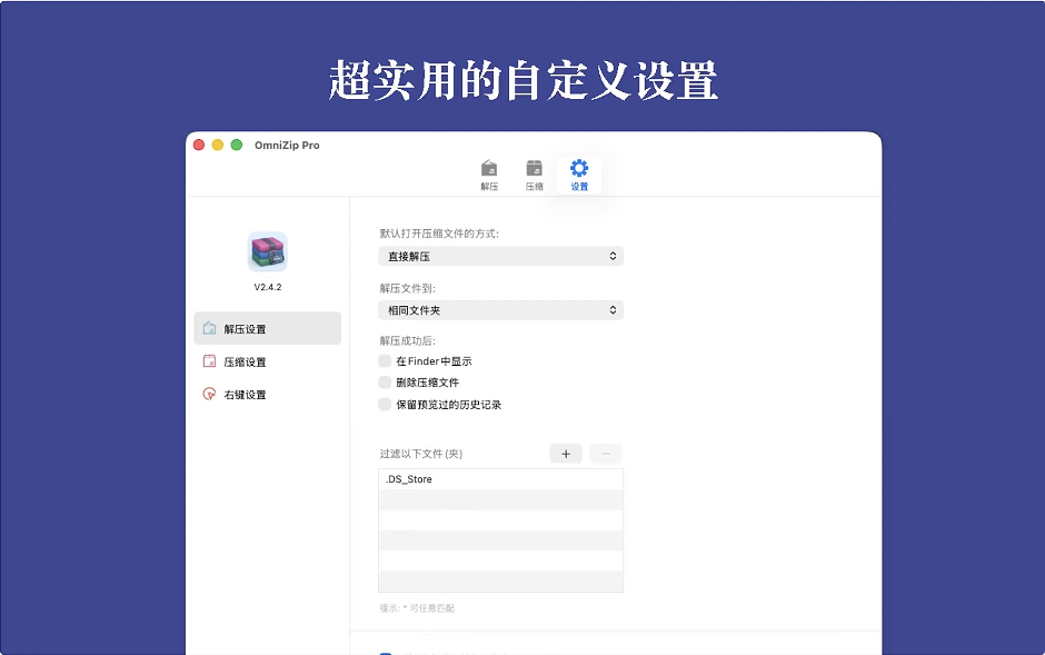 右键集成与自定义过滤:通过 Finder 右键菜单直接调用,提升操作效率;支持按规则排除特定文件。