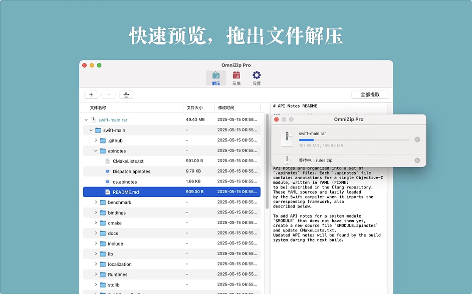 OmniZip 是一款功能强大的全能解压缩工具,支持解压 RAR、7Z、ZIP、TAR、GZIP 等超过100种压缩格式,覆盖日常及专业场景下的绝大多数文件类型需求。