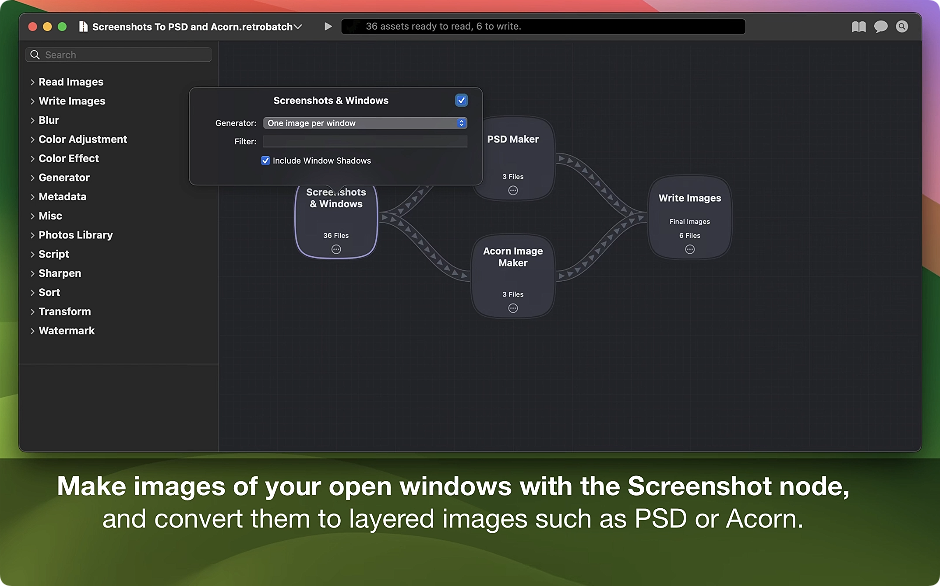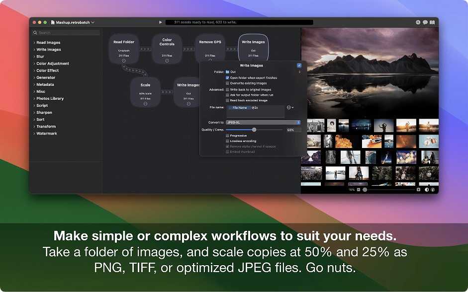 Retrobatch Pro 是一款专为 Mac 设计的节点式批量图像处理工具,由 Flying Meat Inc. 开发,支持通过可视化工作流(Workflow)自动化完成图片的格式转换、元数据编辑、水印添加、尺寸调整等复杂操作。