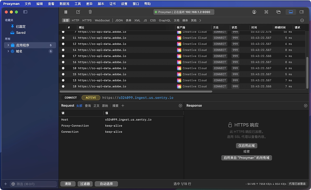 Proxyman 原生支持 HTTP/1.1、HTTP/2、HTTPS、WebSocket、gRPC、Protobuf、TCP 等主流网络协议的流量实时捕获,内置成熟的 SSL/TLS 解密能力,一键安装根证书即可快速解密 HTTPS 加密流量,完整还原请求与响应的全维度数据,包括请求头、请求体、响应头、响应体、Cookie、状态码、响应时长等核心信息。