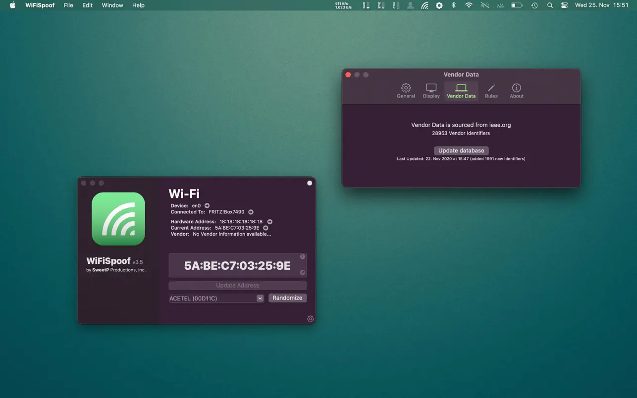 轻松更改 Wi-Fi/以太网 MAC 地址 – 无需摆弄终端。使用内置供应商数据库生成完全随机或特定于供应商的 MAC 地址。